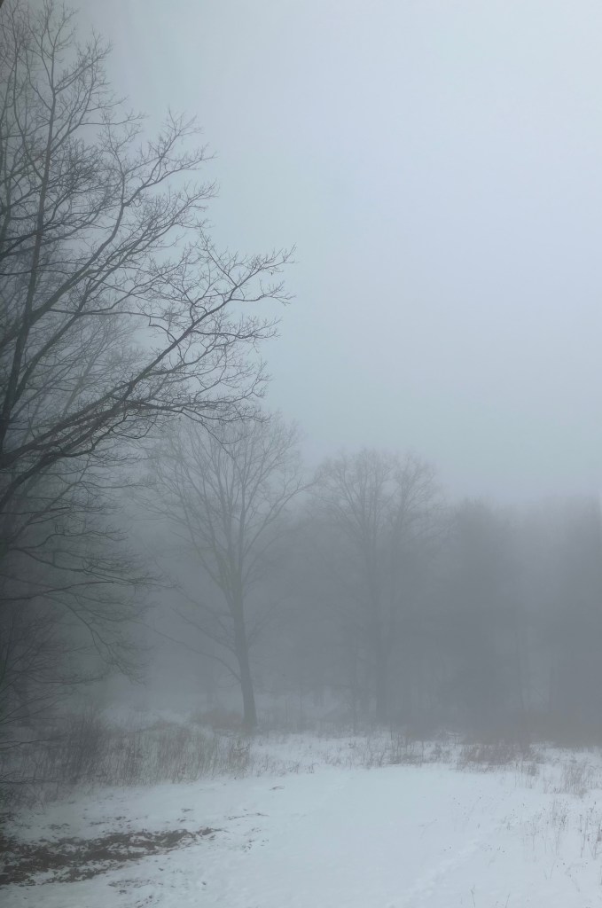 Four and a half years ago, my husband and I had the extraordinary good fortune of acquiring 72 acres of Northern Allegheny Plateau with a viable house, close to town but feeling like the middle of nowhere. We meant to move up there but family health issues intervened. For four years, we rented it out so we could afford to keep it, and this year we decided to move up here at Thanksgiving break. But then we all got Covid, so we decided to move at Christmas, but then we all got influenza. Then we were going to move in January but had a well issue to resolve. Then this week of school break — but another family health issue said nope. Today I’m sitting in the cloud that has enveloped our ridge all day, looking at the dark trees rising from the snow and I can almost hear the sap stirring inside them.